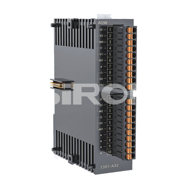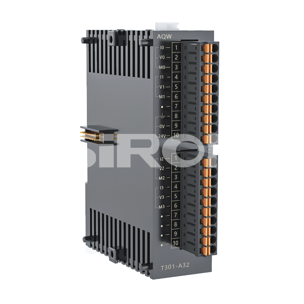 选择示例:T301-A12代表超薄分布式I/O系列,模拟输入/输出特性:4通道模拟输入,0通道模拟输出,接口形式:按终端。